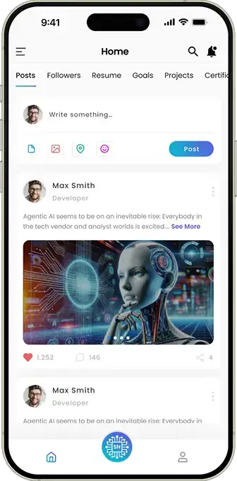 Designed for speed and clarity, the top navigation bar gives users instant access to the most important areas of their journey—Posts, Followers, Resume, Goals, and Projects. With just one tap, they can stay organized, track their growth, and engage with their community without losing focus.